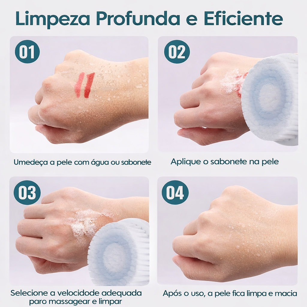 Com 5 cabeças intercambiáveis, você personaliza o cuidado com a sua pele de acordo com cada necessidade, seja para limpeza profunda, esfoliação delicada ou massagem facial revitalizante. Seu design moderno e ergonômico garante praticidade no uso diário, inclusive durante o banho.